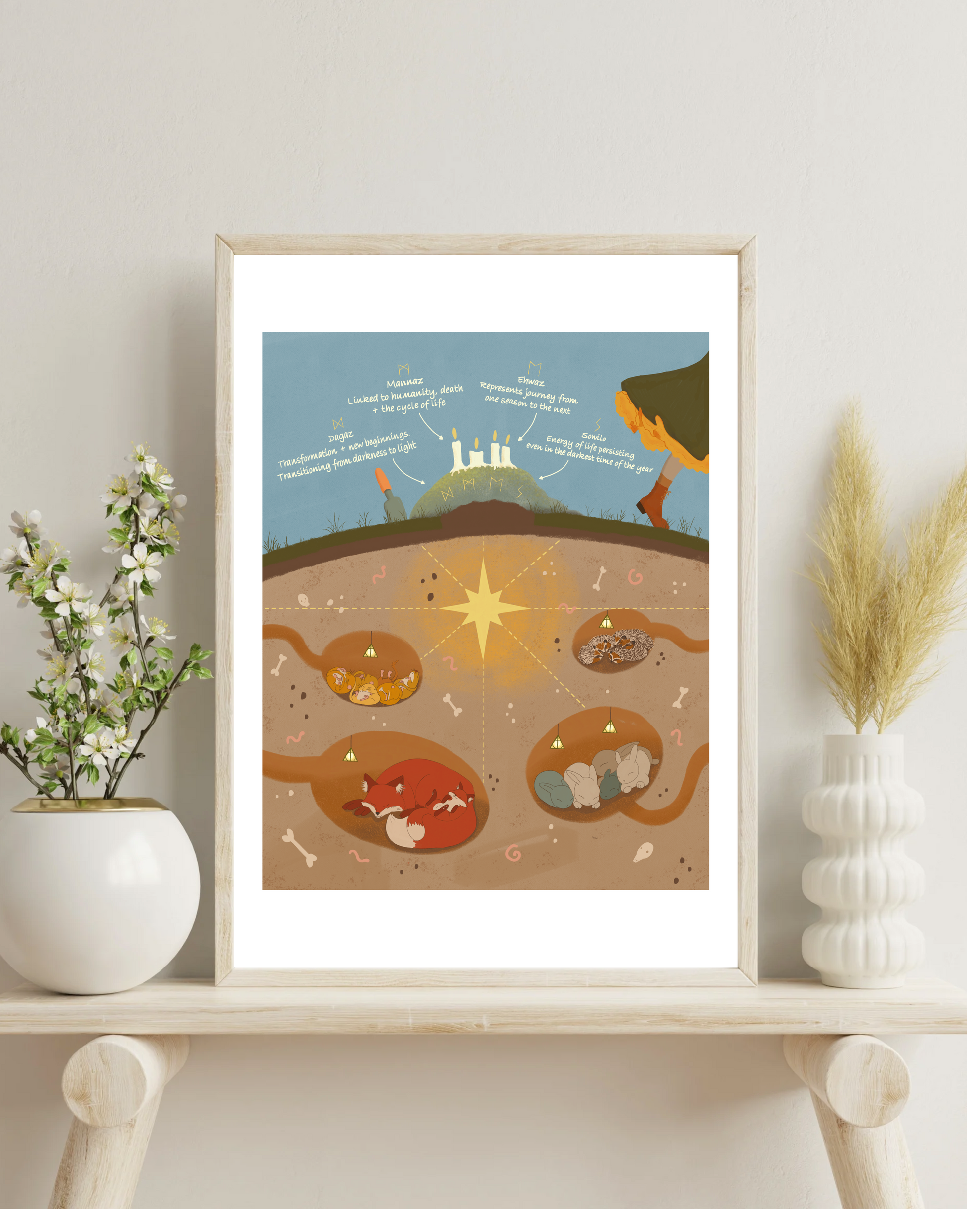 As the year folds inward and the nights deepen, this piece was painted as a charm for the turning season. Beneath the earth, a single star is laid to rest like a seed — watched over by the small creatures that live by the seasons, and marked by runes that whisper of protection, renewal, and return.